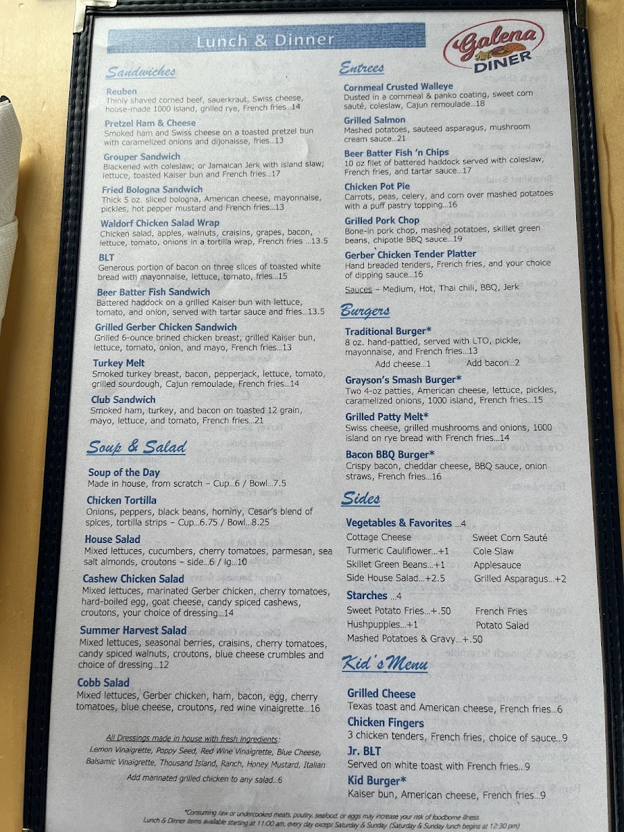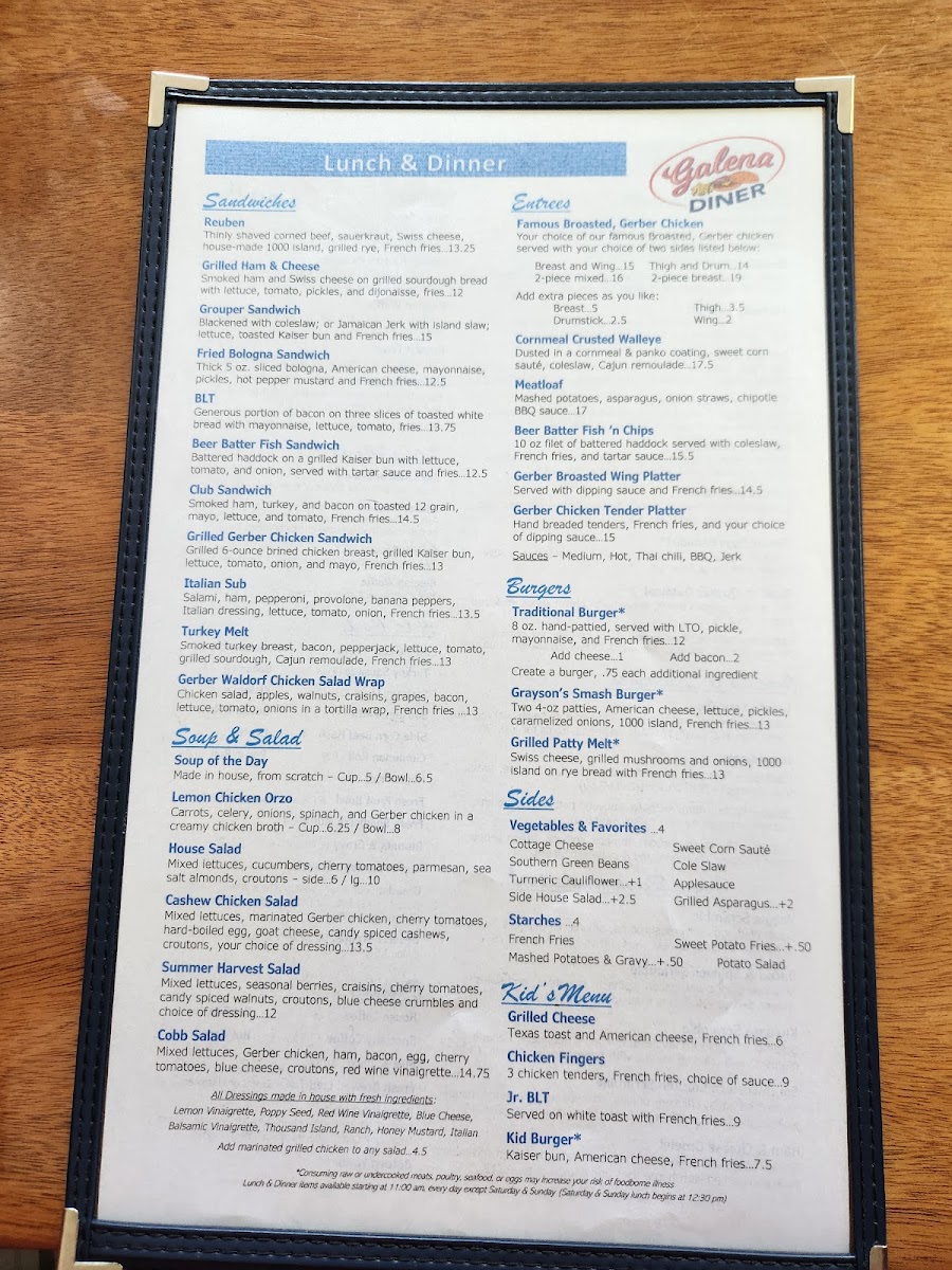 The menu at Galena Diner is a delightful mix of traditional American fare and unique twists that cater to all palates. Don't miss out on their well-loved Famous Broasted Chicken, a dish that many customers rave about for its crispy exterior and juicy interior. If seafood tickles your fancy, try the Cornmeal Crusted Walleye or the Lake Perch Platter, both of which showcase the diner’s commitment to offering fresh, flavorful options. For those in search of a hearty meal, the Beer Batter Fish 'N Chips and the Gerber Broasted Wing Platter are favorites that never disappoint.